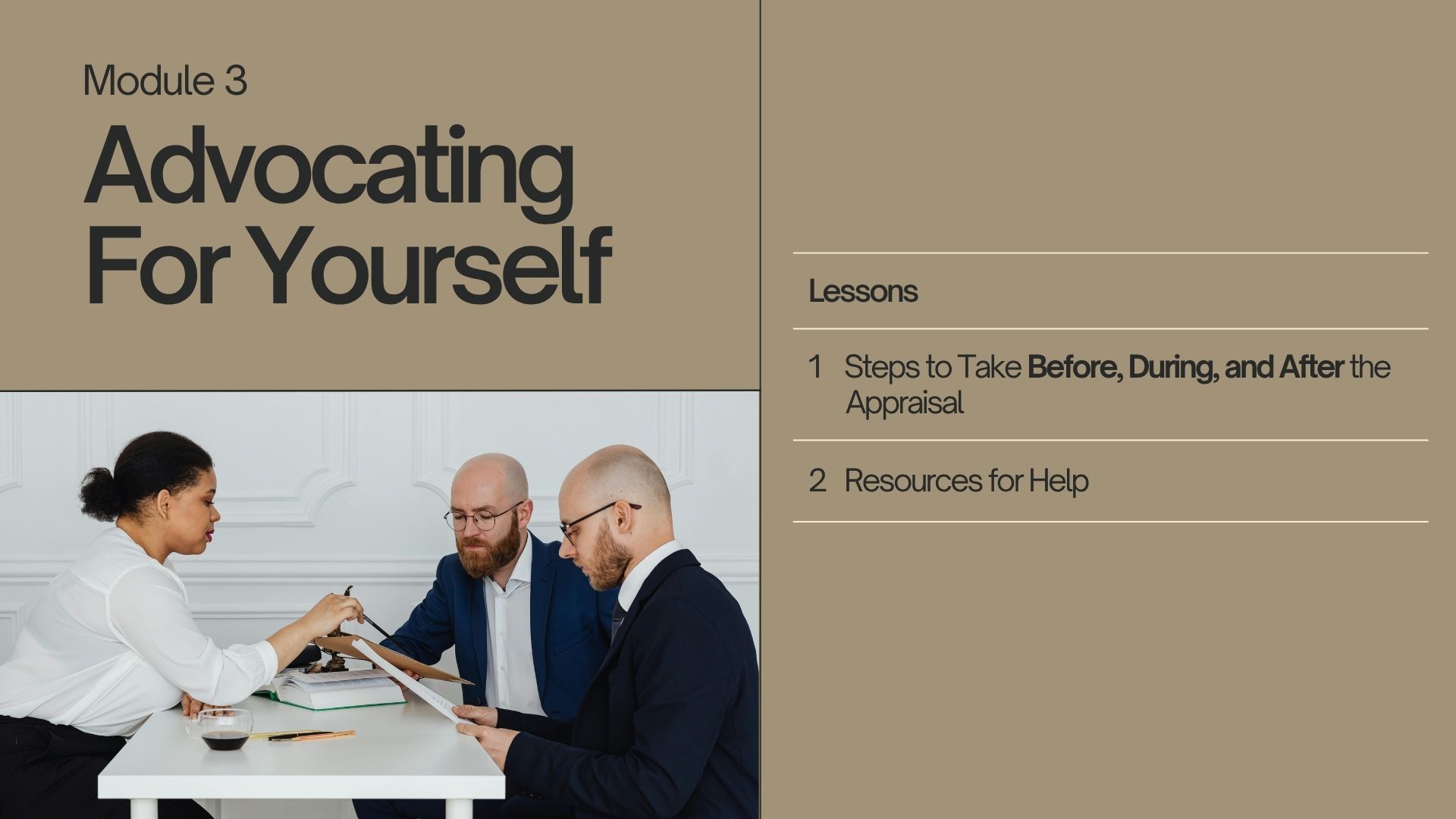 This module empowers you with strategies to protect your interests throughout the appraisal. You’ll learn how to communicate proactively, provide supporting data, and address valuation concerns professionally and credibly. These skills ensure you don’t leave value on the table and that you walk into each appraisal confident, informed, and ready to advocate for the best possible outcome.